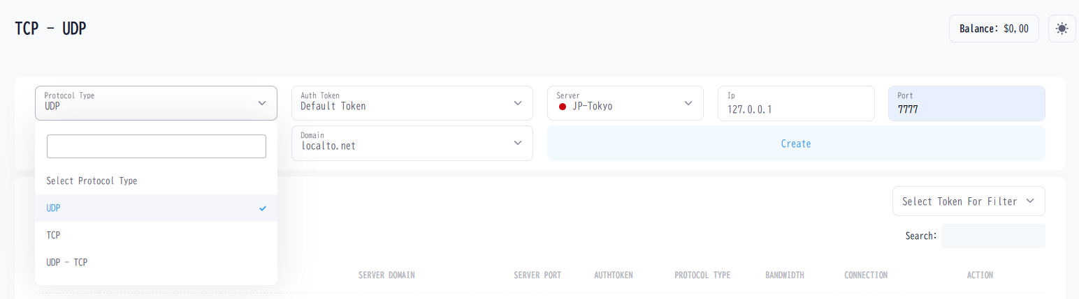 UDPを選択し、サーバーをTokyo,Portを7777にします。