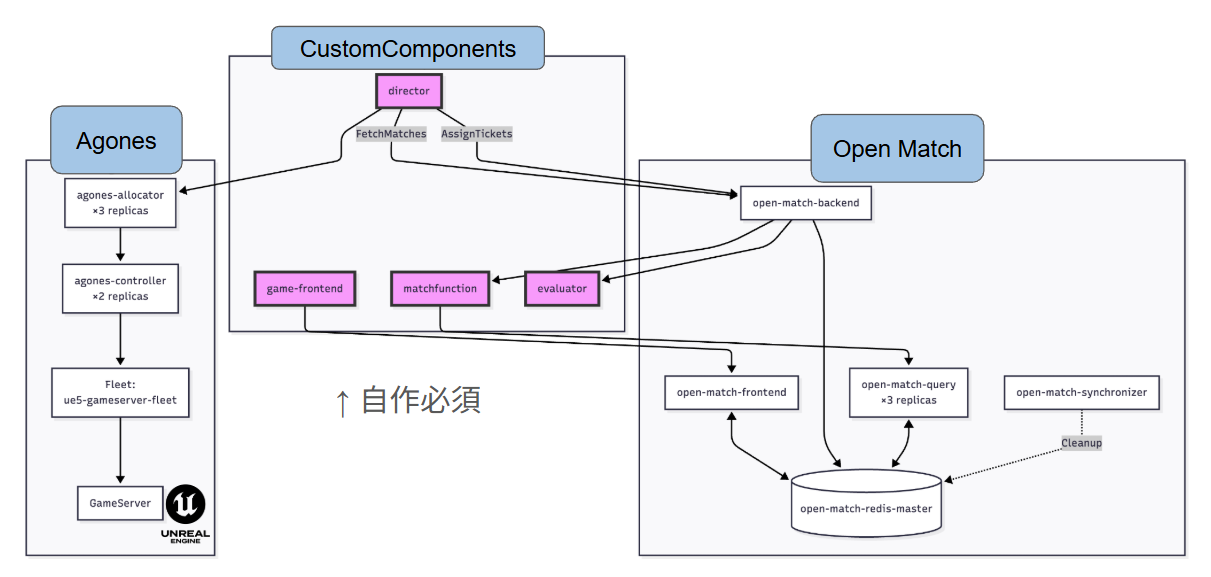 そして、残念なことにOpenMatchはすべての機能を提供しておらず、CustomComponentとして、director,evaluator,match function,geme frontend辺りは自分で書く必要があります。(PythonかGoになります)