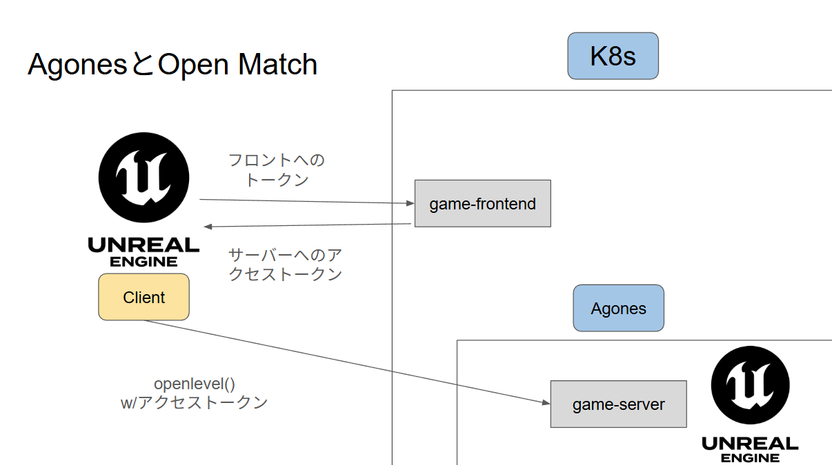 - dedicated serverはもらったJWTをgame frontendのwell-known jsonを元に検証し、確認が取れたらフラグを立て、失敗orタイムアウトした場合はクライアントを削除する