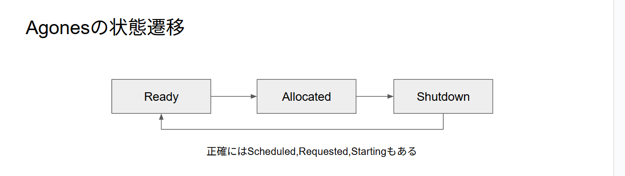 Agonesはゲームインスタンスのライフサイクルを管理しているわけですが、主な状態遷移としてReady、Allocated、Shutdownがあります。